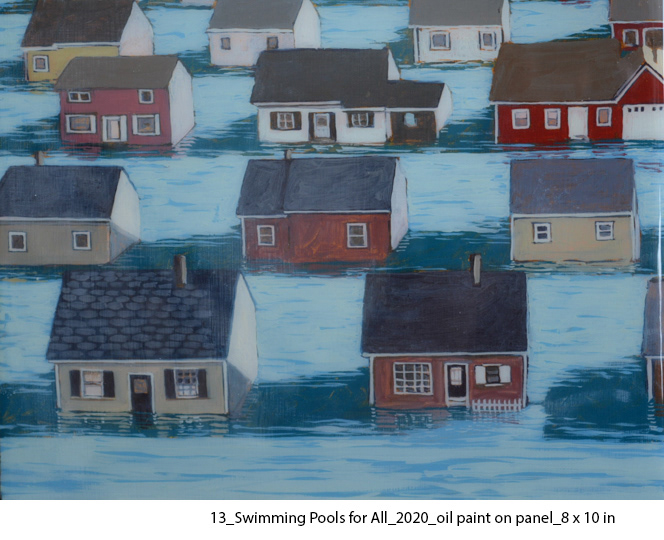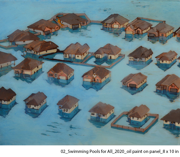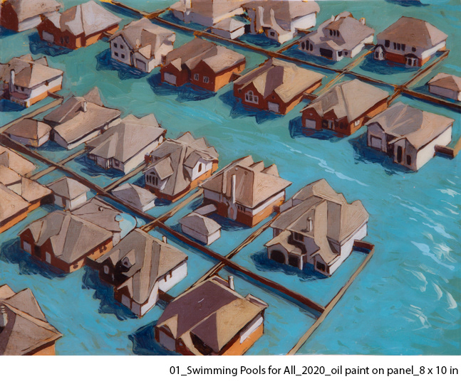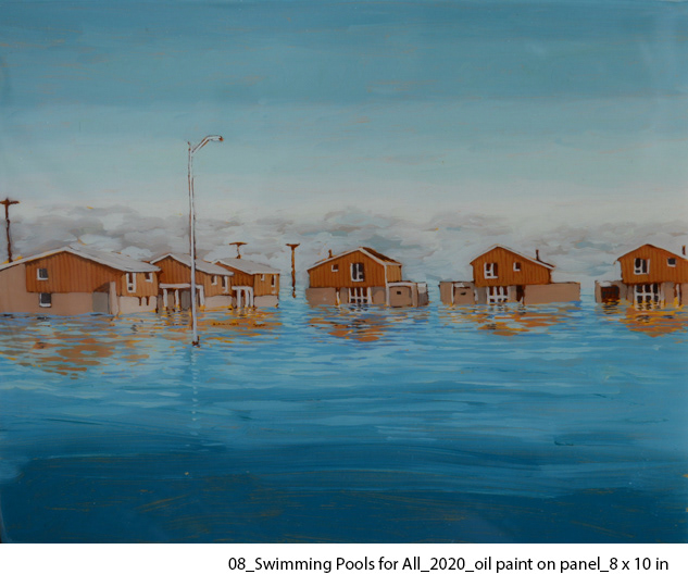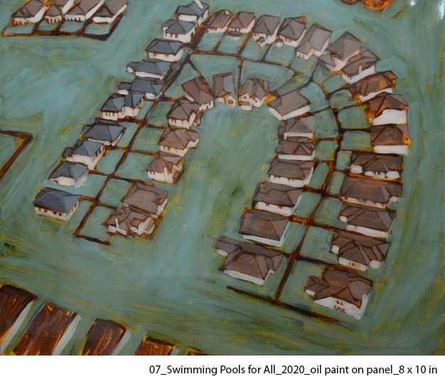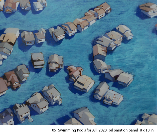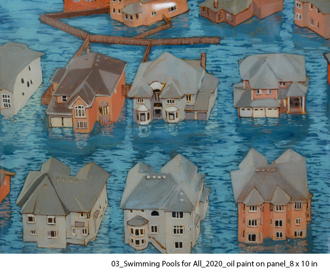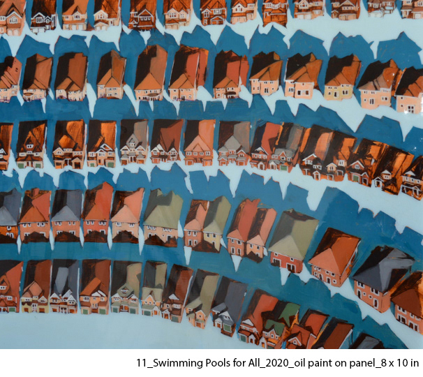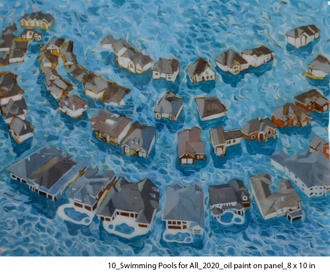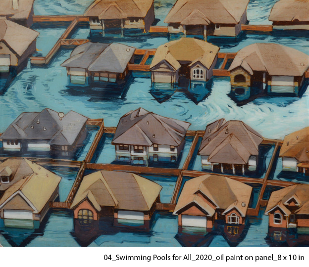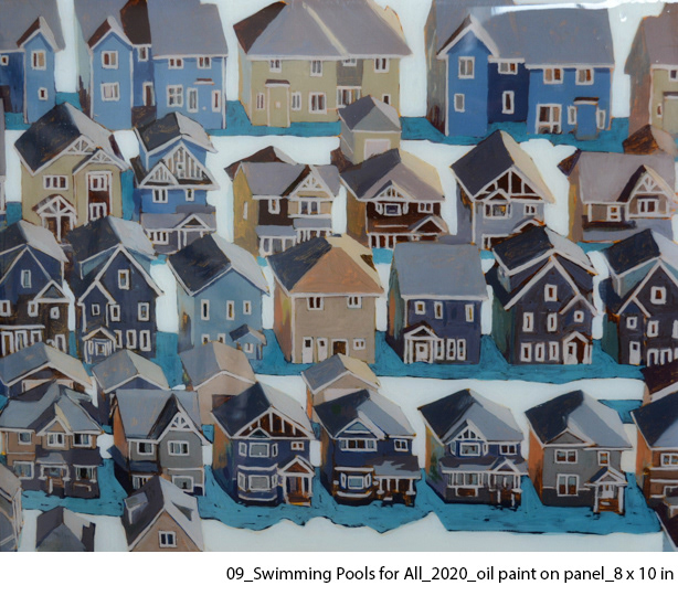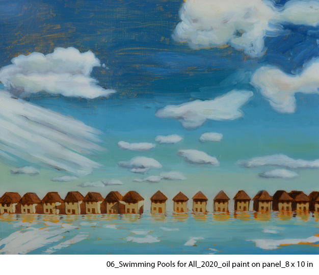 These small-format oil paintings are finished with a thick, high-gloss resin coating, not evident in the photos. This element adds a material component to the concept/subject matter of the paintings.