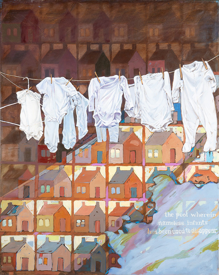 This installation is about the so-called “mother and baby homes” that were established in the 19th and 20th centuries, where girls and women who became pregnant outside of marriage were incarcerated extrajudicially and forced to give birth in isolation and